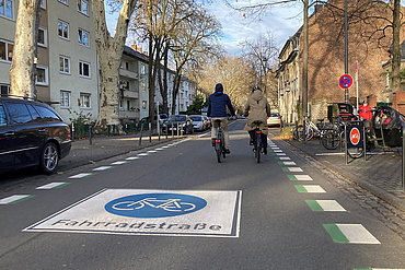 Erstmals Abschnitt einer RadPendlerRoute im Rechtsrheinischen mit der zukünftigen grünen Markierung sichtbar.