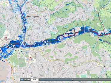 Die Karte zu den räumlichen Schwerpunkten für die Programmlinie 3 zeigt die Hotspots der Wärmebelastung und zentrale klimatische Ausgleichsräume sowie Gebiete mit besonderem Hochwasserrisiko in den Siedlungsbereichen. Die Grundlagen basieren auf den Ergebnissen der KWVS für die Region.