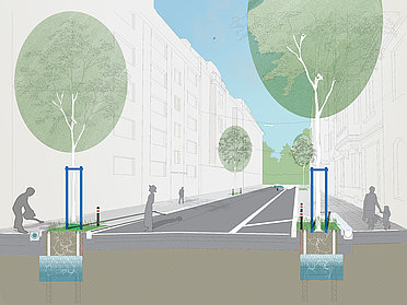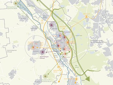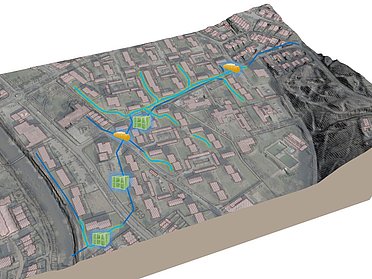 Durch den Ausbau regionaler grün-blauer Infrastrukturen bis in die Städte hinein kann die thermische Belastung über Ventilationsbahnen reduziert und gleichzeitig die Retention im Siedlungszusammenhang gestärkt werden [Programmlinie Grün-Blaue Infrastrukturen]