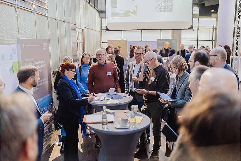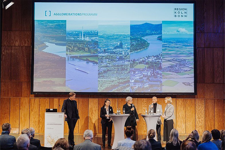 Über die sogenannten Zukunftsprojekte des Programms sowie aktuelle Fördermöglichkeiten konnten sich die Gäste im weiteren Verlauf der Konferenz informieren. Stationen zu den einzelnen Programmlinien, welche beispielsweise Themen wie Siedlungsentwicklung, Klimawandelanpassung, Mobilität, Energie, Ressourcen, Innovation und Lebensqualität behandeln, boten die Möglichkeit, vor Ort mit den Projektträger*innen ins Gespräch zu kommen und sich mit Akteur*innen aus der gesamten Region Köln/Bonn zu vernetzen. Bislang wurden 61 Zukunftsprojekte in das Agglomerationsprogramm aufgenommen. Weitere Vorhaben können sich zweimal jährlich über ein Meldeverfahren für die Aufnahme in das Programm bewerben.