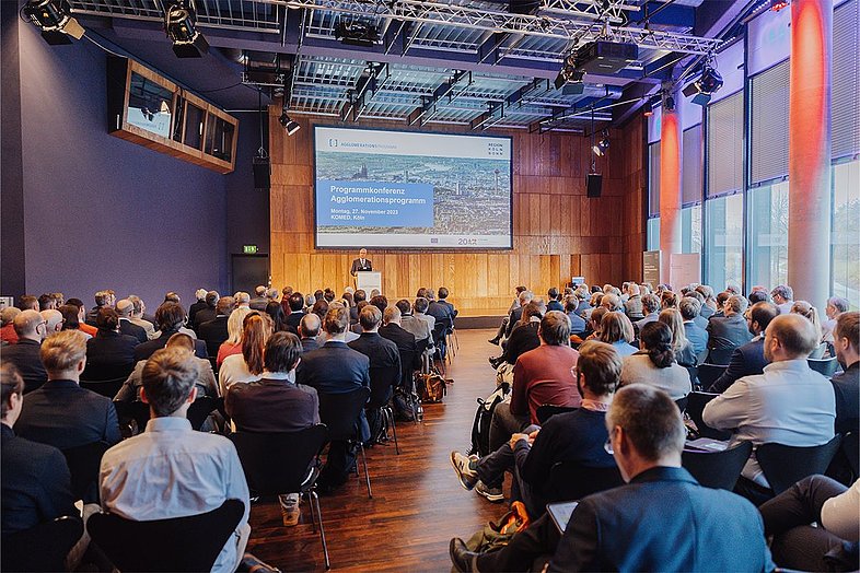Rund 200 Gäste, darunter Vertreter*innen aus Politik und Verwaltung sowie Projektträger*innen und weitere regionale Akteur*innen, versammelten sich am 27. November 2023 auf Einladung des Region Köln/Bonn e.V. im KOMED in Köln, um an der 1. Programmkonferenz zum Agglomerationsprogramm Region Köln/Bonn teilzunehmen. Ziel der Veranstaltung war es, den Gästen den aktuellen Sachstand und die weitere Ausrichtung des Programms vorzustellen und den gemeinsamen Austausch zu fördern.